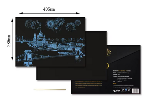 Scratch away and reveal the hidden colors of your favorite city. Includes 1 bamboo stylus, 1 city scratch board of your choice and 1 practice scratch board.